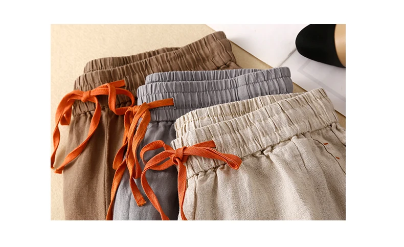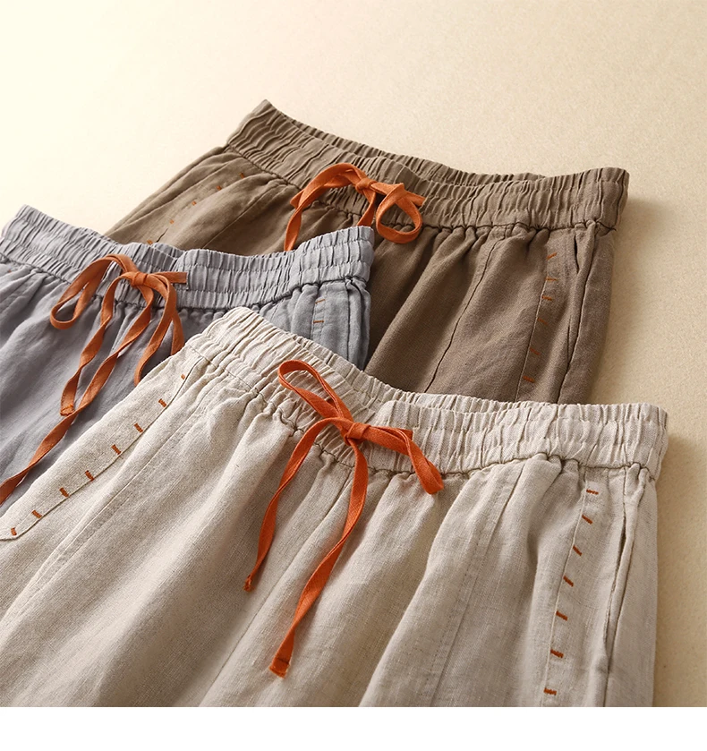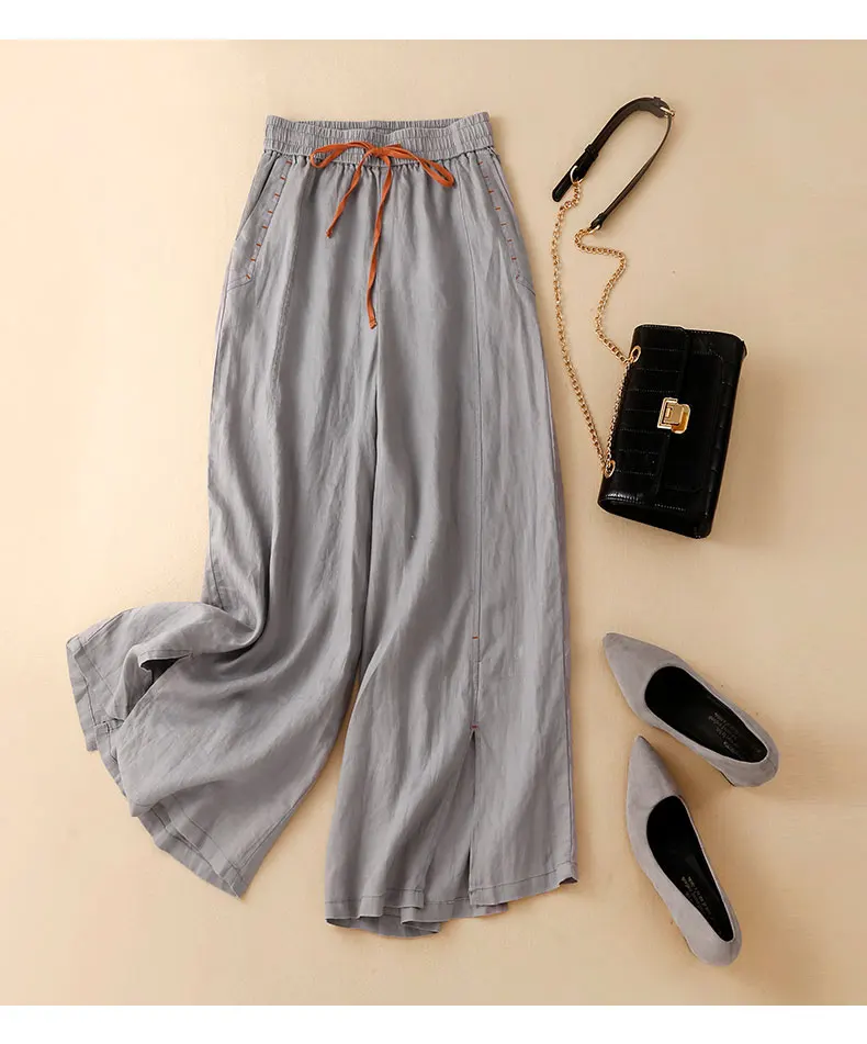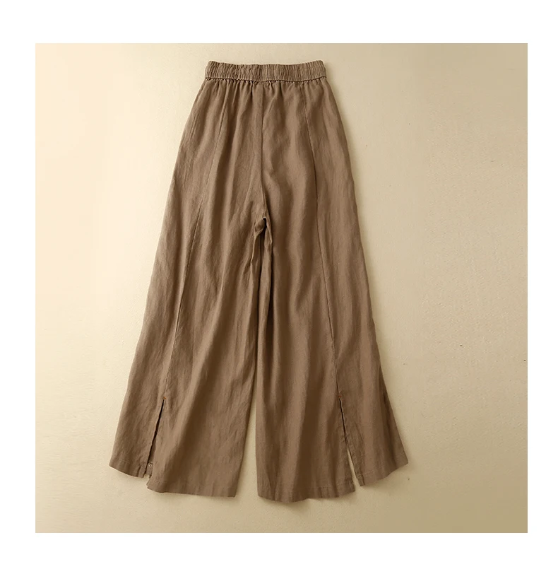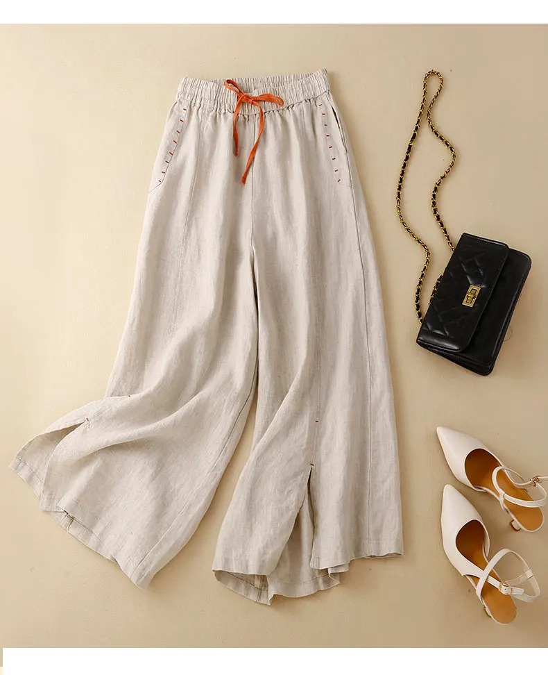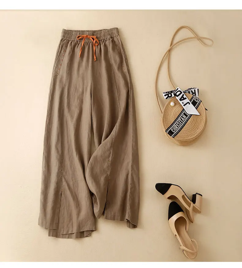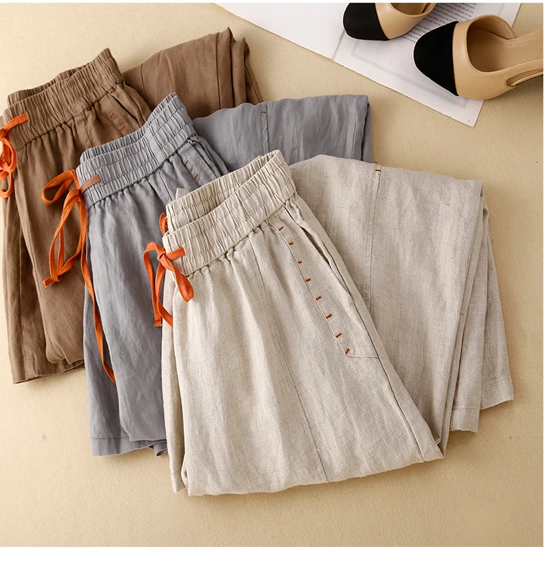 Beige Cotton Linen Casual Elastic High Waist Loose Wide Leg Women's Pants Ankle-Length Pants For Women Clothing 2024 Fashion