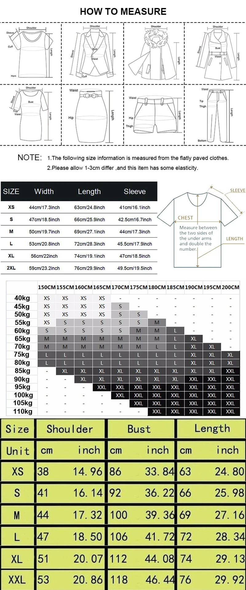 Size Shoulder/cm Bust/cm Length/cm Suited Height XS 38 44 60 160cm S 39 45 62 165cm M 40 50 64 170cm L 42 53 64.5 175cm XL 47 56 65 180cm